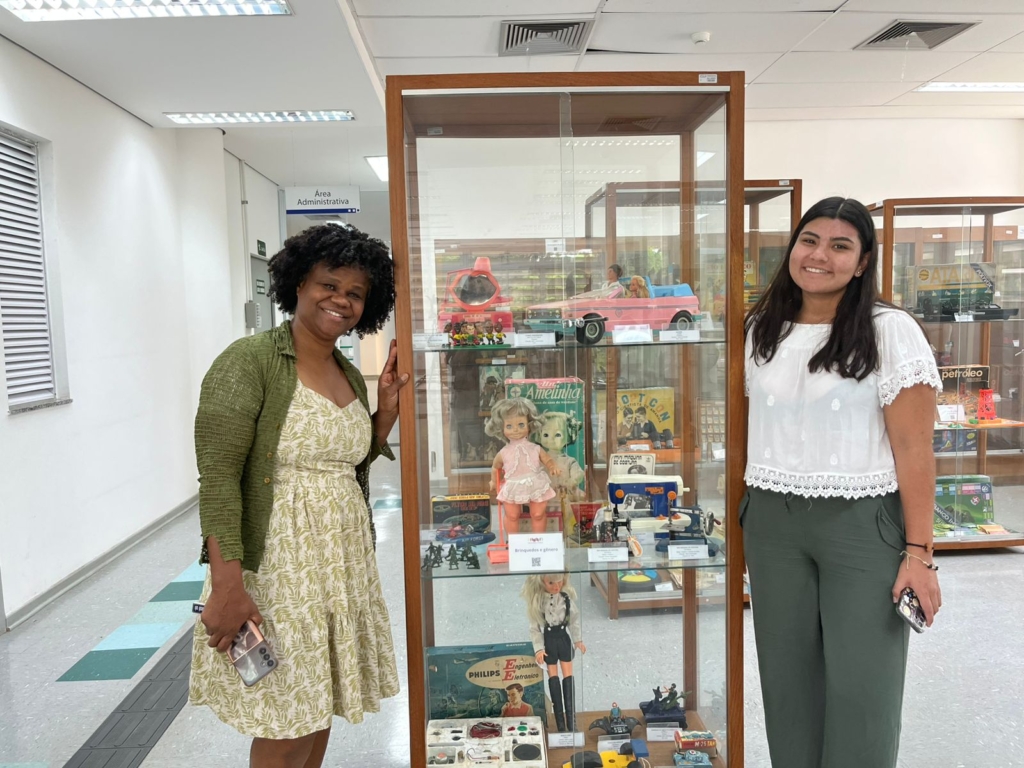 Después de la visita, conversé con Carla para profundizar en dos vitrinas que me llamaron especialmente la atención: una dedicada a la cultura afro-brasileña y otra al género. Consideré importante reflexionar sobre cómo, a través de los juguetes, se abordan estos temas con las infancias. En la vitrina sobre género, observé cómo los juguetes tradicionalmente destinados a las niñas estaban asociados al hogar: máquinas de coser, muñecas y colores como el rosado o blanco; mientras que los de los niños se relacionaban con la construcción, el fútbol o los automóviles, predominando el azul o rojo. Carla señaló que hoy el cambio no está en la fabricación, sino en la mirada social, pues tanto niñas como niños pueden jugar con cualquier tipo de juguete.