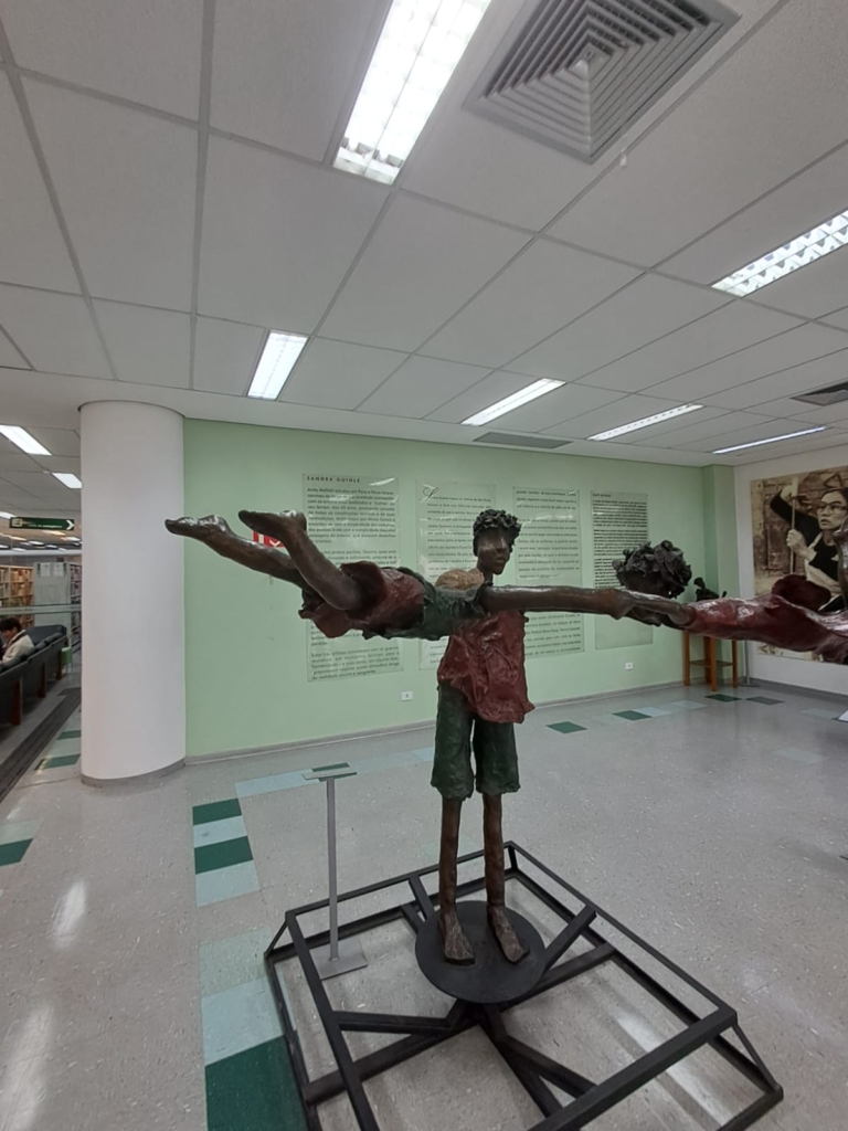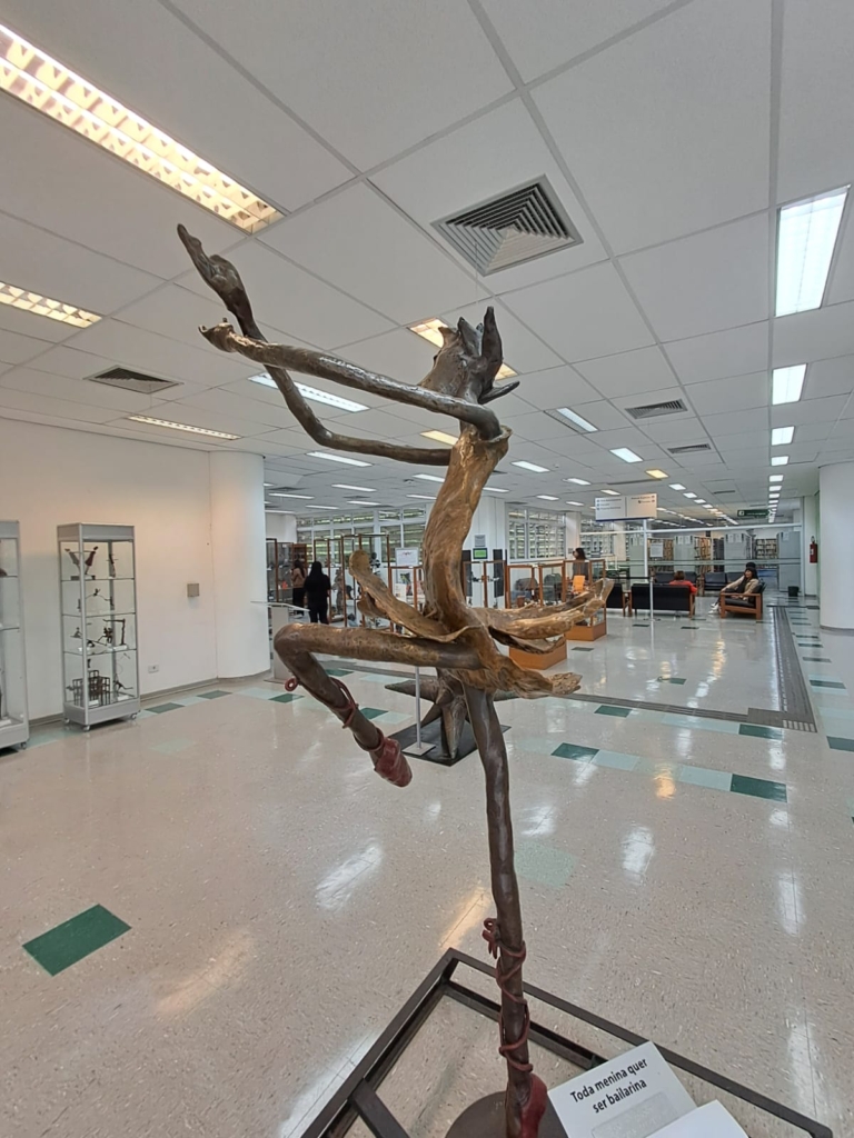 Como parte de las actividades de la pasantía en la USP, visité el Museu da Educação e do Brinquedo (MEB), ubicado en la biblioteca de la Facultad de Educación. Durante el recorrido, Carla, encargada del museo, explicó que el MEB fue creado en 1999 por una docente especialista en educación infantil con el propósito de preservar y difundir la memoria educativa a través de los juegos, juguetes y actividades lúdicas. En el espacio se exhiben juguetes de distintas épocas y materiales: personajes tallados en hoja de maíz, artefactos elaborados por niños, materiales didácticos y juegos educativos. También destacan esculturas metálicas que representan escenas de juegos tradicionales como la rayuela, el sube y baja o volar una cometa.
