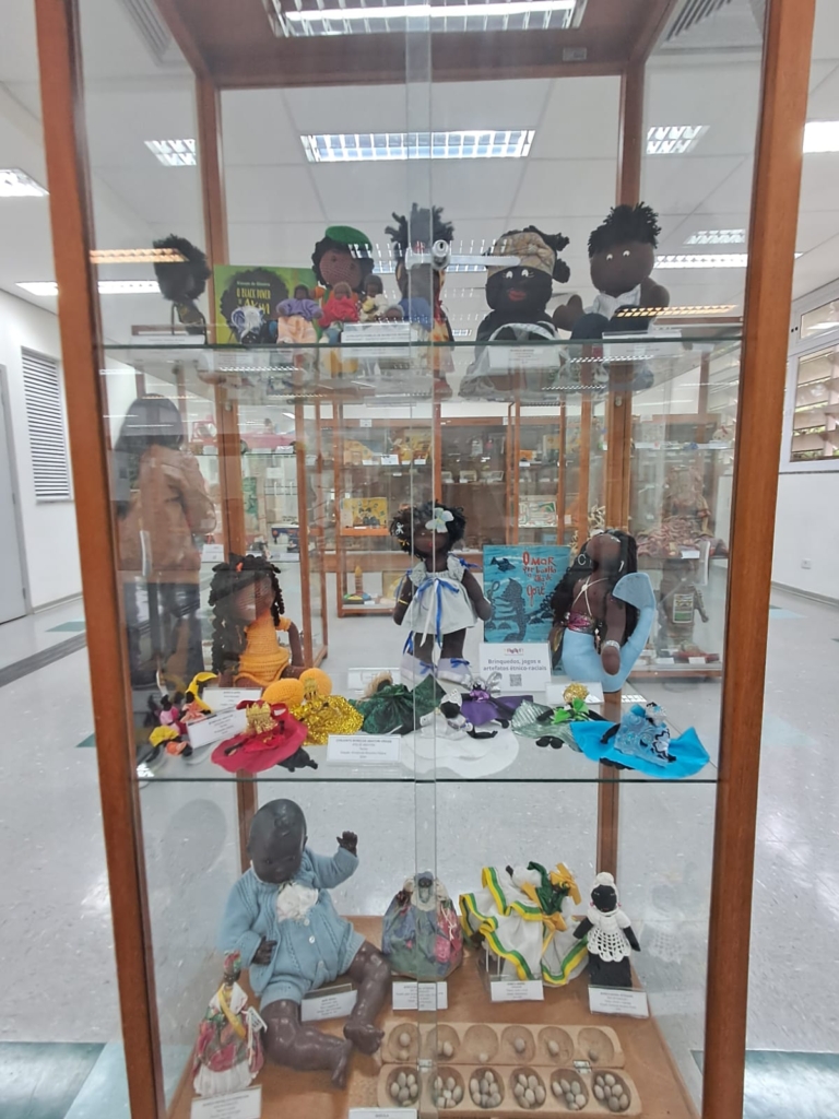 La segunda vitrina mostraba juguetes con características afro-brasileñas, y Carla comentó que muchos niños reaccionaron con sorpresa al ver estos juguetes, lo que evidencia la falta de representación de la diversidad en los espacios infantiles. Ella destacó que es fundamental incluirlos porque el 50 % de la población brasileña es afrodescendiente, y estos juguetes permiten que los niños se identifiquen y comprendan la riqueza cultural que los rodea. Como menciona Salazar (2015), el juego y los juguetes están profundamente vinculados con la cultura, pues a través de las historias e imaginarios que los niños crean, van comprendiendo la realidad y otorgándole significado.
