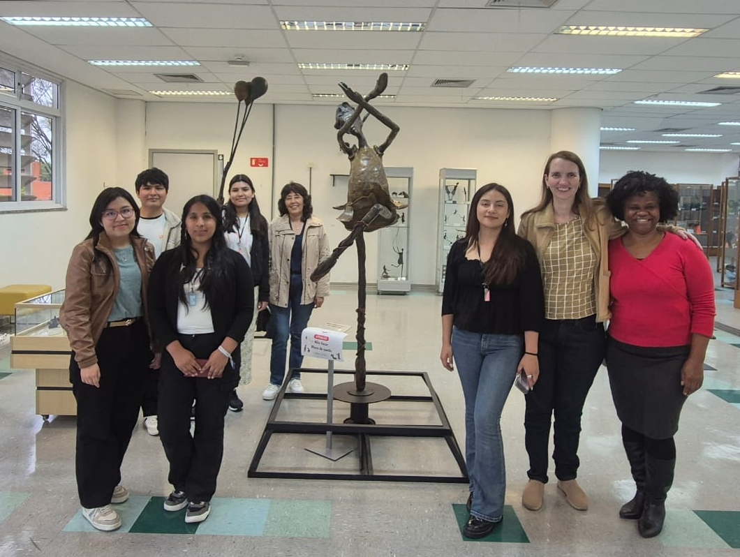 Como parte de las actividades de la pasantía en la USP, visité el Museu da Educação e do Brinquedo (MEB), ubicado en la biblioteca de la Facultad de Educación. Durante el recorrido, Carla, encargada del museo, explicó que el MEB fue creado en 1999 por una docente especialista en educación infantil con el propósito de preservar y difundir la memoria educativa a través de los juegos, juguetes y actividades lúdicas. En el espacio se exhiben juguetes de distintas épocas y materiales: personajes tallados en hoja de maíz, artefactos elaborados por niños, materiales didácticos y juegos educativos. También destacan esculturas metálicas que representan escenas de juegos tradicionales como la rayuela, el sube y baja o volar una cometa.